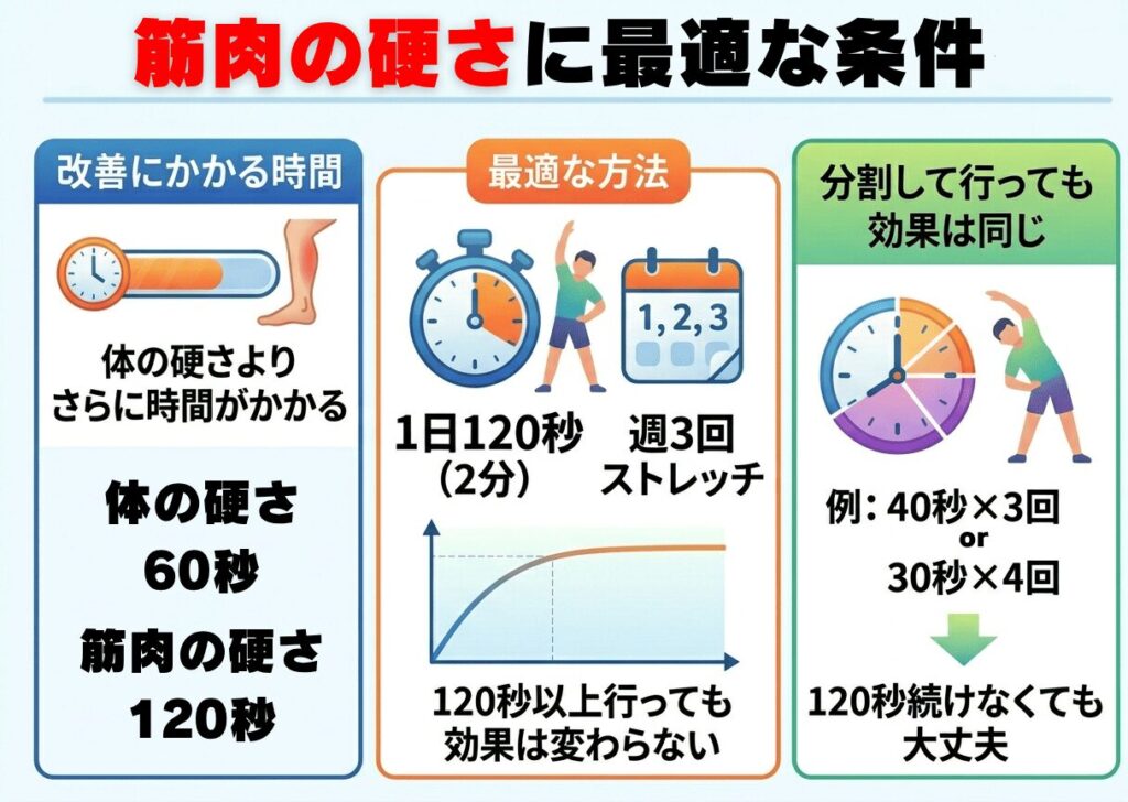 筋肉の硬さを改善するには、1日120秒(2分)で週3回ストレッチする必要があるといわれています。