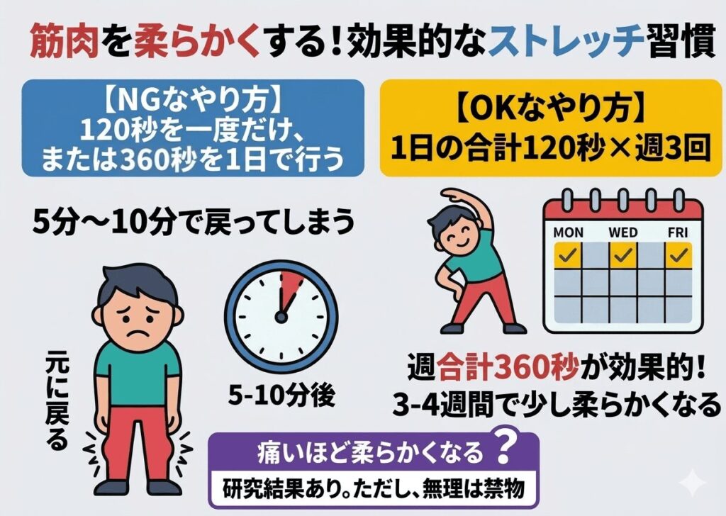 1日120秒を週3回ストレッチを行うのが、最も筋肉を柔らかくするのに効果的な習慣です。