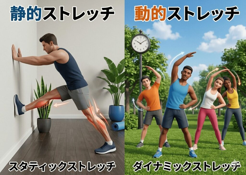 反対に、ラジオ体操や肩回しなど動かしながら筋肉の伸び縮みを繰り返す運動を、ダイナミックストレッチ(動的ストレッチ)と言います。