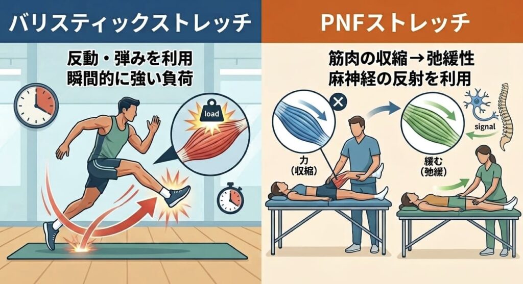 反動や弾みを利用して、筋肉に瞬間的に強い負荷をかけるバリスティックストレッチというものがあります。