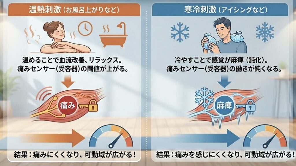 お風呂に入った後にストレッチすると柔らかくなるというのは、温熱刺激によって痛みのセンサーが反応しにくくなるため、動ける範囲が広くなるという仕組みです。
