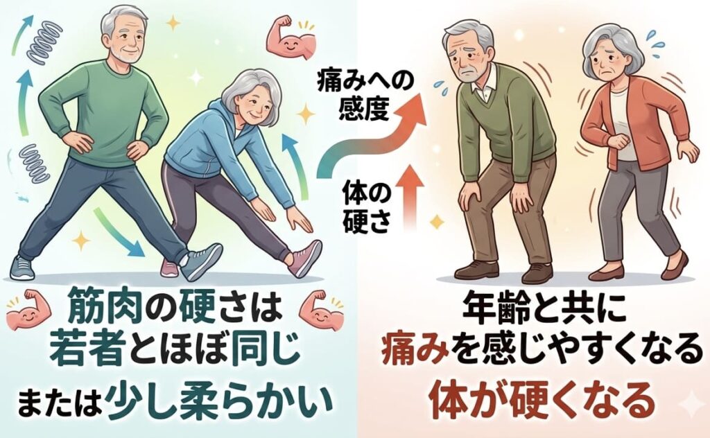 年齢を重ねると痛みに対する感度が上がり、簡単にいうと我慢強さが低下するため、体が硬くなります。