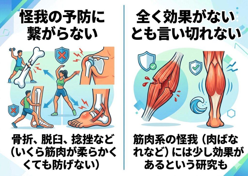 また、ストレッチは筋肉系の怪我(肉ばなれなど)には少し効果があるという研究があるため、全く効果がないとも言い切れません。
