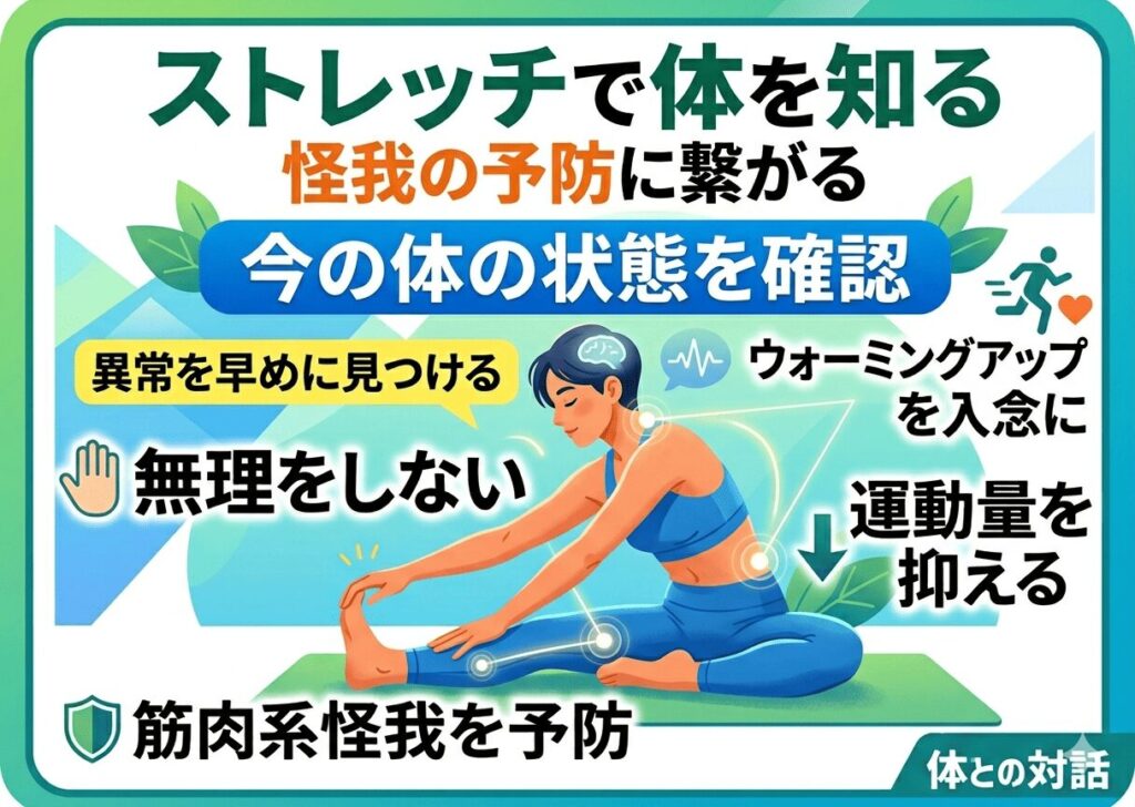 これは、単に入念にストレッチをしたことで、筋肉の状態が良いからというわけではなく、ストレッチを行うことで、自身の今の体の状態を確認できるため、入念にストレッチをしている人であれば、自身の体に異常を見つけることができて、ウォーミングアップをいつもより入念にしたり、運動量を抑えたり、無理をしないようにするため、怪我のリスクが下がります。