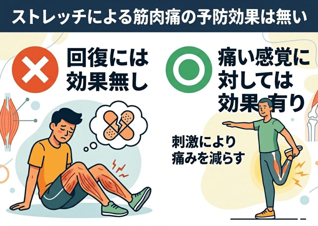 ストレッチは筋肉の回復には効果はありませんが、痛い感覚に対しては効果があります。