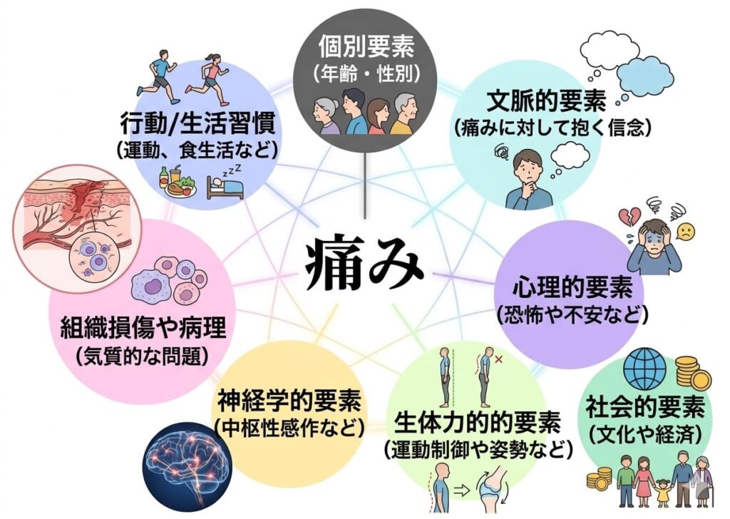 痛みを構成する要素は大きく分けて8つあり、体の組織についての項目はたった一つのみです。