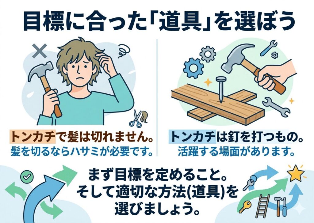 ご自身が目指す目標を定めた上で、それにあった方法(道具)を適切に選択することが大切です。