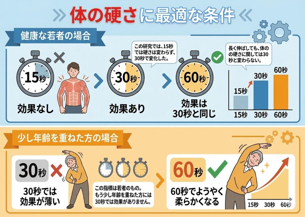 また、この指標は健康的な若者の指標で、もう少し年齢を重ねた方であれば30秒では効果が無く、60秒でようやく柔らかくなるという違いがあります。