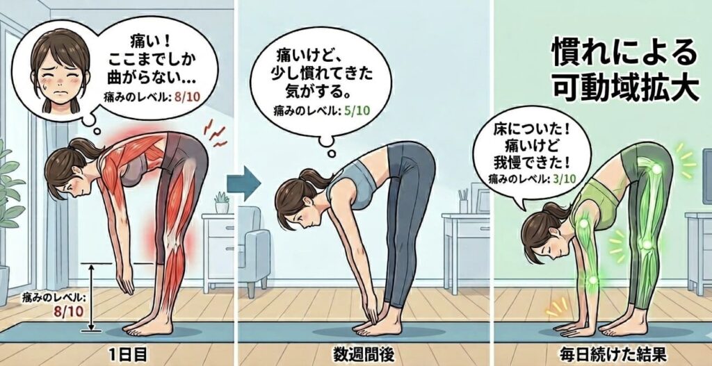 立った状態から前屈した時に、毎日続けているとだんだん床につくようになったという経験がある方が多いと思いますが、最新の研究では、痛みにだんだん慣れてくるからだんだん床まで動かせるようになるというのが通説です。