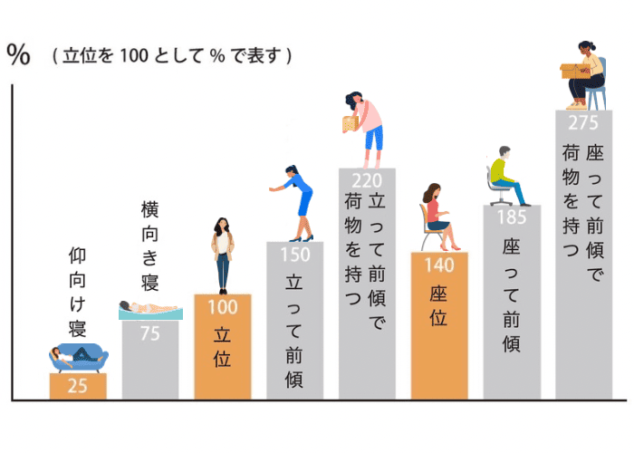 また、日常姿勢と椎間板内圧の関係を見てみると、立っている姿勢が座っている姿勢よりも負担が高く、座って前傾で荷物を持つ動作が椎間板への負担が最も高いため、意識的に避けることが症状を悪化させないためのポイントです。