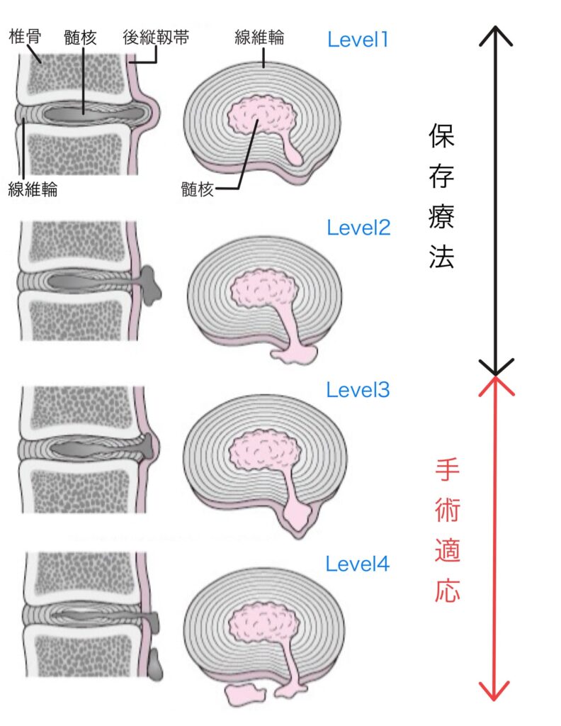 腰椎椎間板ヘルニアは4つのグレードに分類されており、右の図のようにレベル3、レベル4は手術の適応、レベル1、レベル2は手術は行わず、保存療法の適応であるとされています。