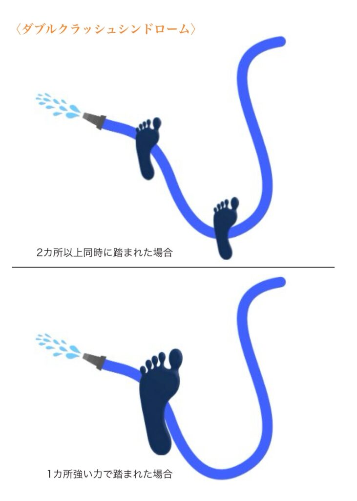 ダブルクラッシュシンドロームとは、末梢神経が2か所以上で障害されることで、痺れの症状が増強したり持続しやすくなる病態のことを言います。